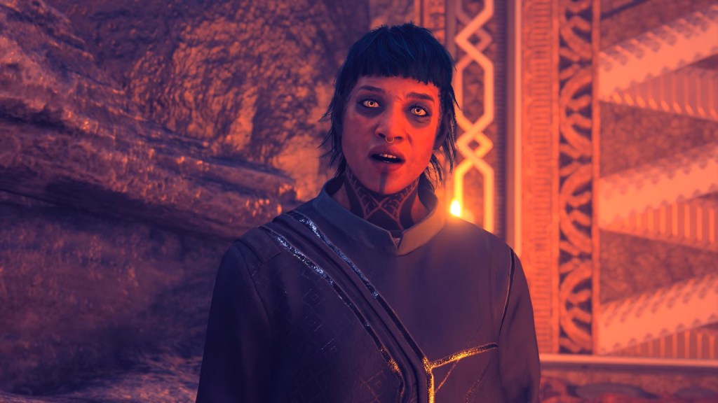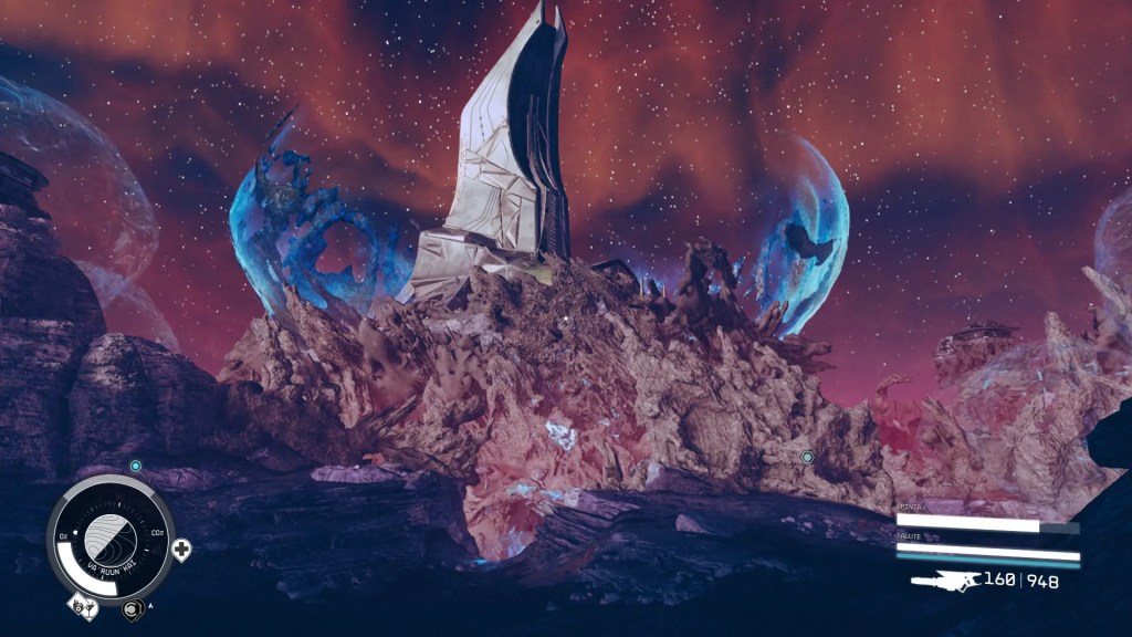 Sin dai primi minuti, il setting proposto da Bethesda si rivela interessante. Niente a che vedere con le “tinte horror” sbandierate in fase di presentazione dal reparto marketing però si avverte un filo di piacevole suspence, unita ad una palette cromatica diversa dal solito cinereo “Starfield style”. La direzione artistica mostra tutta la sua personalità anche una volta atterrati sulla terraferma. Il pianeta è avvolto in colori purpurei dove spiccano le sfere di un sfavillante azzurro elettrico che avvolgono la Città di Scaglie, il tutto sotto una densa polvere di stelle. Tra crepacci, caverne, santuari incastonati nelle montagne il world building rende merito ai ragazzi di Bethesda e lo stesso vale anche per la piccola cittadina di Dazra e la caratterizzazione estetica del popolo Va’ruu’n.