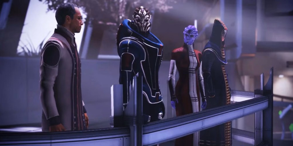 Si fa quindi conoscenza di tutte le razze che popolano la galassia. Le Asari, spesso considerate la più influente e rispettata specie senziente nella galassia, note per la loro eleganza, diplomazia, e attitudine biotica. I Salarian, la secondo specie ad insediarsi nel Consiglio della Cittadella, dal metabolismo iperattivo, rapidi di pensiero e maestri nell’osservazione; ideali per compiti sia di spionaggio che di sabotaggio. I Turian, dalla spiccata indole imperialista e militare, primi fautori della creazione della SSC (Servizio di Sicurezza della Cittadella), membri come terza specie del Consiglio in virtù della battaglia vinta contro i Krogan, grandi rettili bipedi dalla marca aggressività. originari del pianeta Tuchanka. Ed è proprio in questa vicenda che sia il primo intreccio dove “il nemico del mio nemico mio amico”. I Salarian sfruttarono le capacità di combattimento dei Krogan nella guerra contro i Rachni, ma quando il loro sviluppo militare crebbe enormemente i Salarian dettero ai Turian la genofagia, un’arma biologica capace di rendere sterili le femmine Krogan. Il calo delle nascite depotenzierà in maniera drastica, sia in numero che in caratteristiche, la specie Krogan.