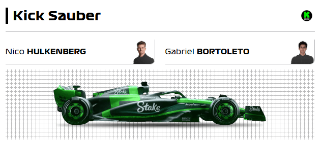 Per la Stake F1 Kick fu Sauber non ancora Audi, si prospetta un altro anno di transizione, con il team principal di Mattia Binotto chiamato a fare qualche punto in più della stagione precedente. Ci vorrà ben poco, ma il punto di partenza è veramente basso. Anche qua coppia nuova, con l’esperto Hulkenberg a fare da chioccia al debuttante Bortoleto.
